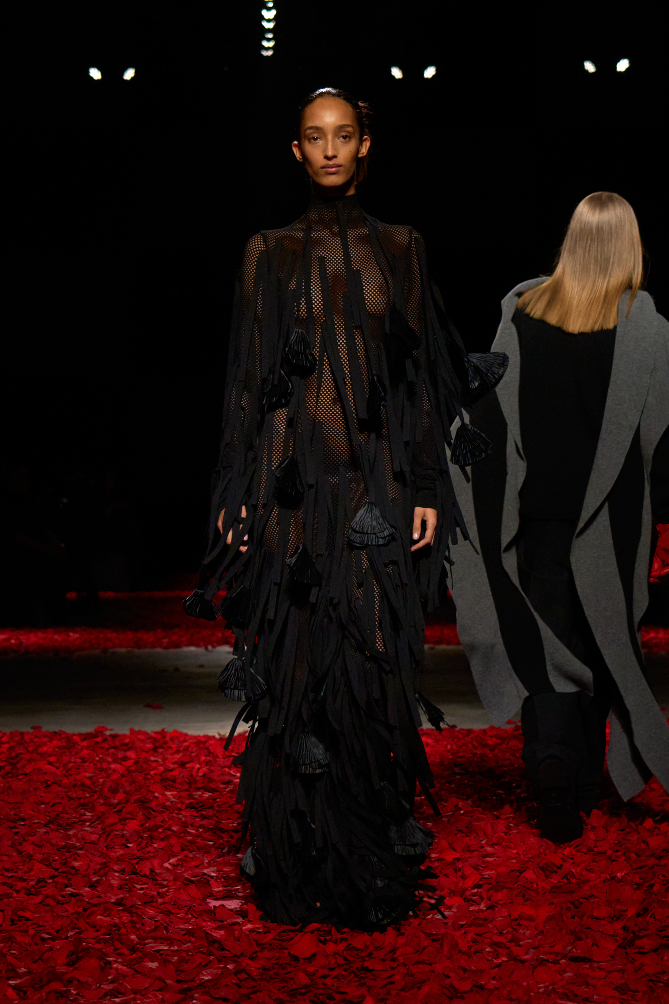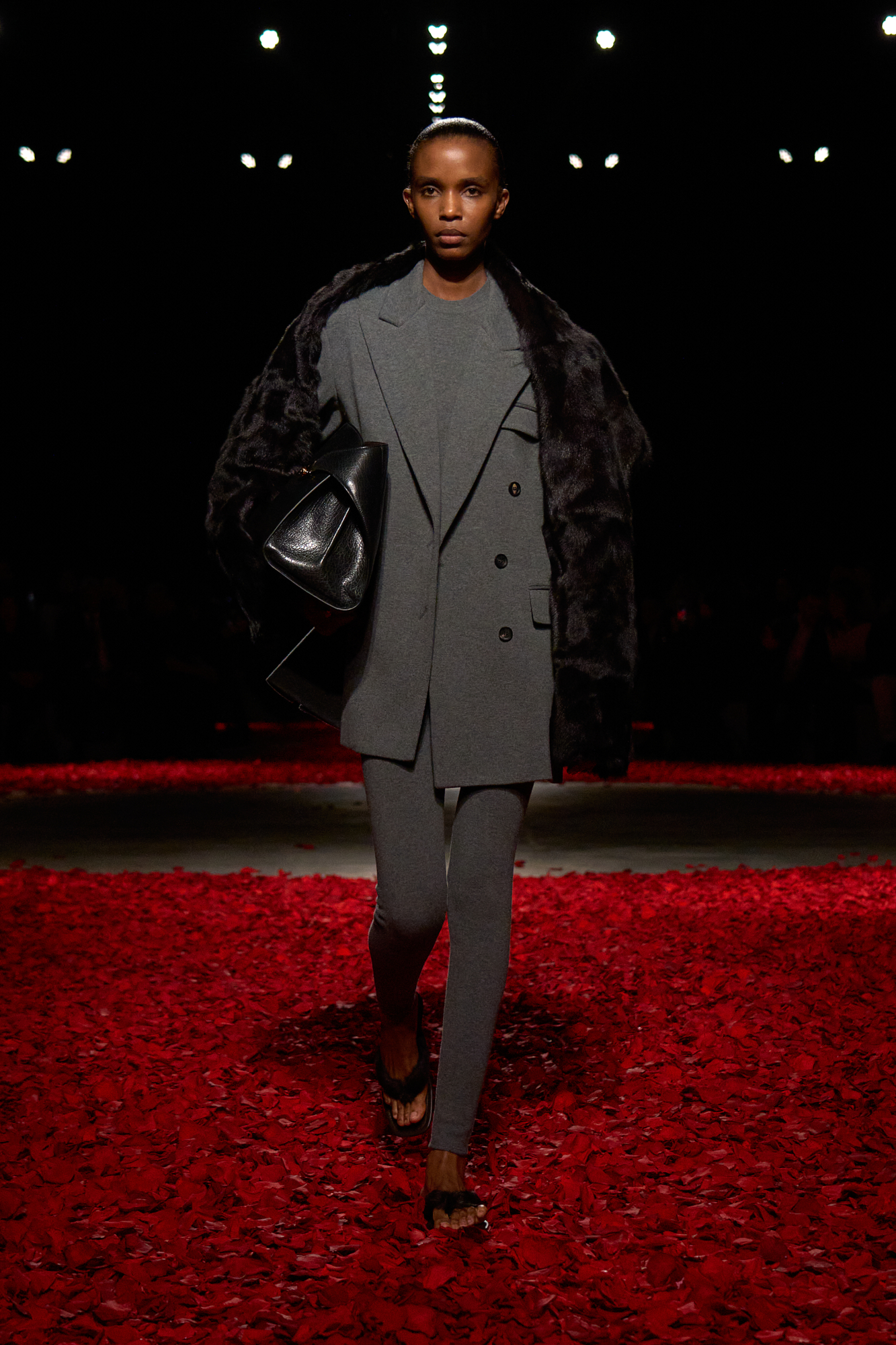 الإكسسوارات في هذه المجموعة تلعب دورًا محوريًا في التعبير عن الروح العامة للموسم. الحقائب المسائية التي تزخرفها زهور الأورغانزا، والنماذج الجديدة من حقيبة Hug التي تظهر بشكل مضاعف وتلتف حول الجسم، تضيف لمسة فنية تنقل نفس السريالية المميزة للمجموعة. كما تظهر الحقائب المدببة من الفرو التي تنبض بالحياة وتبث في القطع طاقة حركية نابضة.