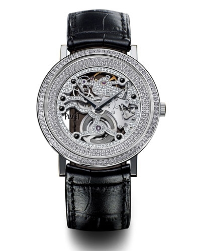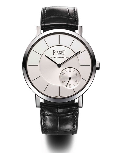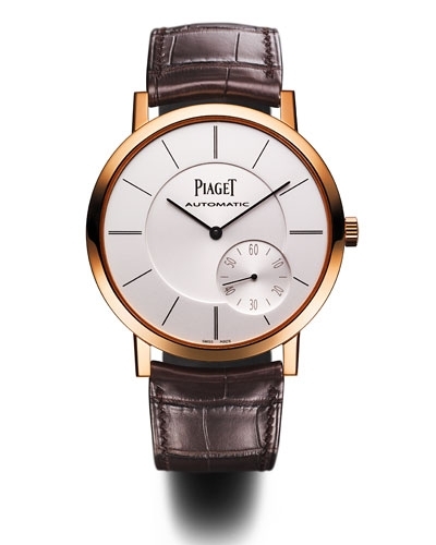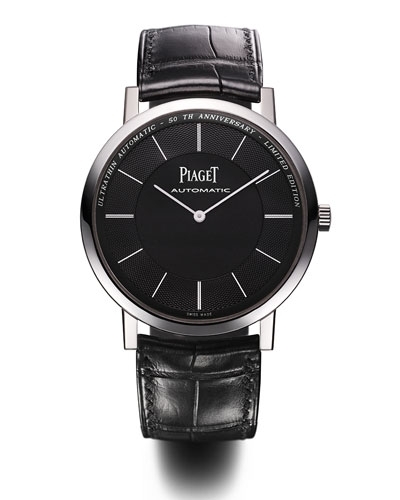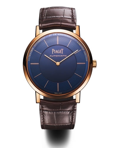 أما ساعة Aliplano فتحتفل هذه السنة بعيدها الخمسين، الأمر الذي اعتبر بمثابة مناسبة لدار بياجيه Piaget لتقديم التحية إلى إرثها الغني في الساعات مع التقدم خطوة نحو المستقبل. تم ابتكار هذه الساعة عام 1960 وكانت تعمل بحركة ميكانيكية ذات شحن تلقائي. واليوم، بعد خمسين عاماً، باتت الساعة مزودة بالعيار 1208P، الذي يصبح مع الـ2.35 مم، العيار الأوتوماتيكي الأكثر رواجاً في الأسواق. تتخذ ساعة Altiplano الحالية علبة أكبر قليلاً (43 مم) وهي الساعة الميكانيكية الآلية الأكثر تسطيحاً في فئتها: 5.25 مم. تجسد الساعة الجديدة الأناقة الهادئة بعلبتها المصنوعة من الذهب الأبيض والسوار المصنوع من جلد التمساح الأسود. وهي متوافرة أيضاً بالذهب الوردي والرمادي بعيار 18 قيراطاً.