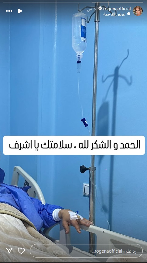 ونشرت روجينا صورة لزوجها وهو راقد على سرير المرض في المستشفى، حيث ظهرت يده موصولة بالأمصال الطبية، وعلّقت على الصورة بكلمات طمأنت بها الجمهور إذ قالت: "الحمد والشكر لله... سلامتك يا أشرف"، من دون أن تكشف عن تفاصيل حالته الصحية.