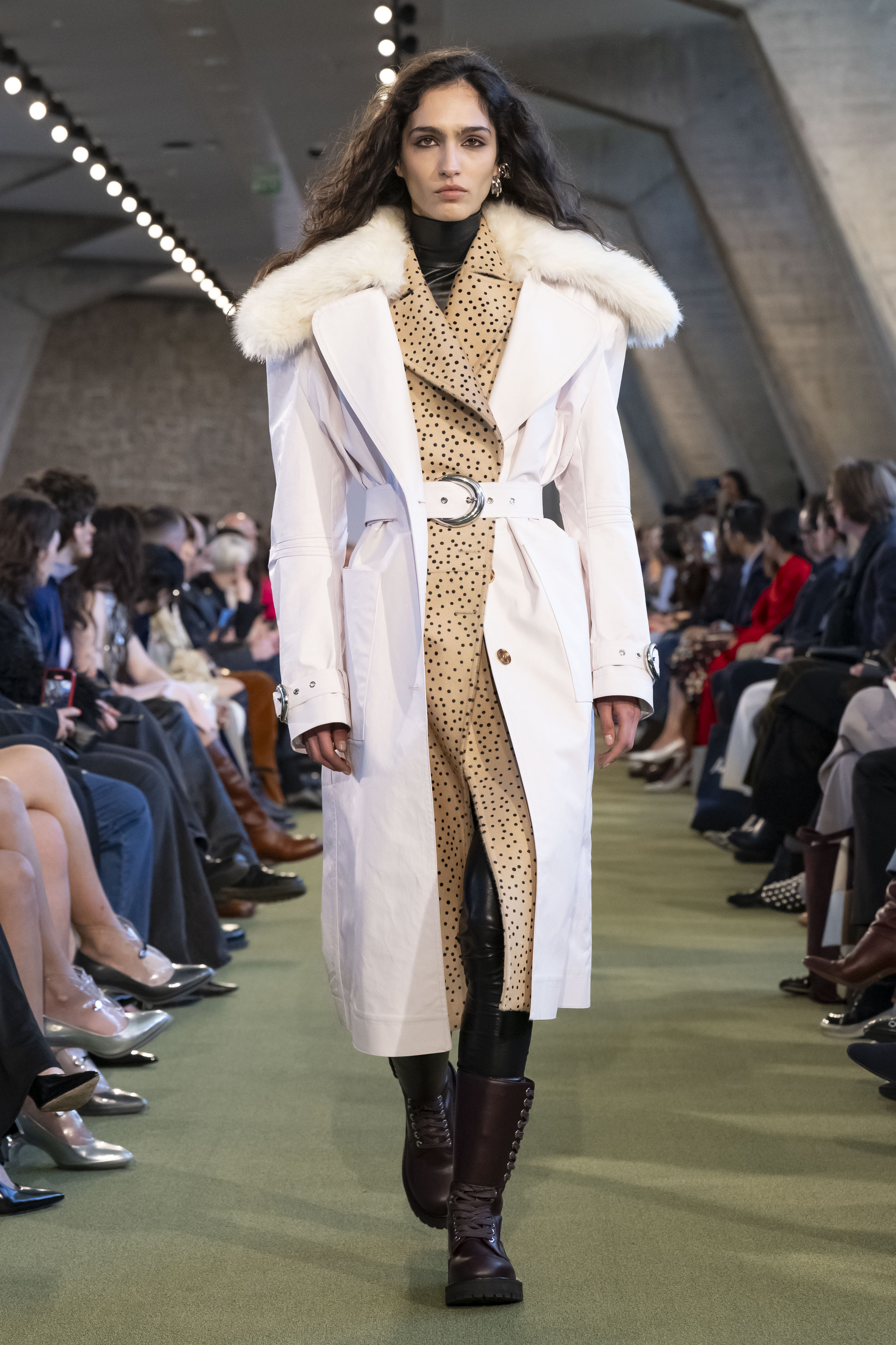 الفراء الحديث يغلّف بأناقة، ولكنه أيضاً برّي ومطلق العنان، من المعاطف الطبيعية الفخمة إلى التنانير المكوّنة من ذيول كثيفة تتأرجح في الحركة. تستكشف الصور الظلّية الأكثر صرامة في الصوف الكلاسيكي والقطن المغطّى مفاهيم مختلفة للمنطقة بين الخارج والداخل: انفجارات محكومة من الفراء في الجانب السفلي من التنانير الاسكتلندية، والأسطح الفضّية المُشّعة المتقشّرة، والأوشحة المزيّنة بالخرز التي تؤكد على الخطوط، والألواح المفكّكة التي تلتف حول لمعان الجلد الثاني. ثم يتم تمزيق هذه العناصر وتعزيزها من خلال الشقوق الاستراتيجية، والأنسجة ثلاثية الأبعاد، والوفرة في الترتر الصغير. ينتقل غموض هذا الفائض إلى طبعة متفجّرة من الحبوب الملوّنة التي تم تقديمها كبدلة أنيقة.