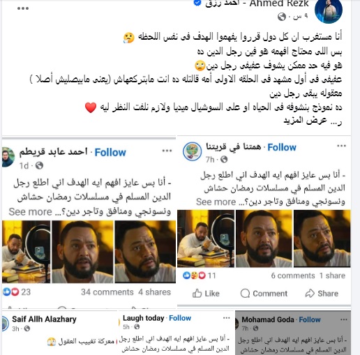 نشر الفنان أحمد رزق من خلال حسابه الخاص في "فيسبوك"، مجموعة صور لحسابات مختلفة على موقع التواصل الاجتماعي الشهير، تتحدث عن شخصية "عفيفي" التي يؤديها في مسلسل "سيد الناس" الذي يُعرض ضمن الموسم الرمضاني الحالي، وحملت كلها نفس التعليق.