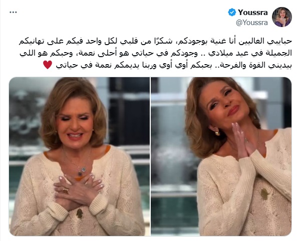 ونشرت يسرا صوراً لها وعلّقت عليها بهذه الكلمات الرقيقة: "حبايبي الغاليين أنا غنيّة بوجودكم، شكراً من قلبي لكل واحد فيكم على تهانيكم الجميلة في عيد ميلادي... وجودكم في حياتي هو أحلى نعمة، وحبّكم هو إللي بيديني القوة والفرحة... بحبكم أوي أوي، وربنا يديمكم نعمة في حياتي".