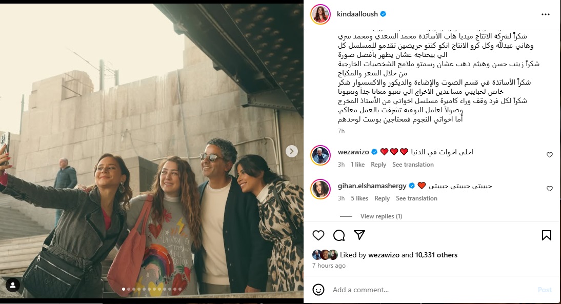 نشرت الفنانة كندة علوش عبر حسابها الخاص في "إنستغرام" مجموعة صور ظهرت فيها مع الفنانتين نيللي كريم وروبي والمخرج محمد شاكر خضير، وبعض من فريق عمل مسلسل "إخواتي" الذي يُعرض ضمن الموسم الرمضاني الحالي، وجّهت من خلالها رسالة شكر وامتنان إلى صنّاع المسلسل.