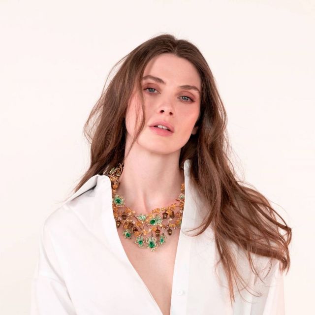عقد مميز من مجموعة Milly Dentelle من Dior High Jewellery مصنوع بحِرفية عالية، حيث تزيّنه أحجار كريمة متنوعة تشمل الزمرد الأخضر اللامع والروبي الأحمر النابض بالحياة، بالإضافة إلى الماس الذي يضفي عليه بريقاً لا مثيل له. تبرز الجماليات الخاصة بالتصميم من خلال الماسة الكبيرة في المنتصف، التي تتميز بلونها الأصفر الرائع الذي يضيف لمسة من الفخامة والتميّز. هذا العقد ليس مجرد قطعة مجوهرات، بل هو تحفة فنية تعكس الذوق الرفيع والاهتمام بأدق التفاصيل، مما يجعله إضافة مثالية لأي مناسبة خاصة.