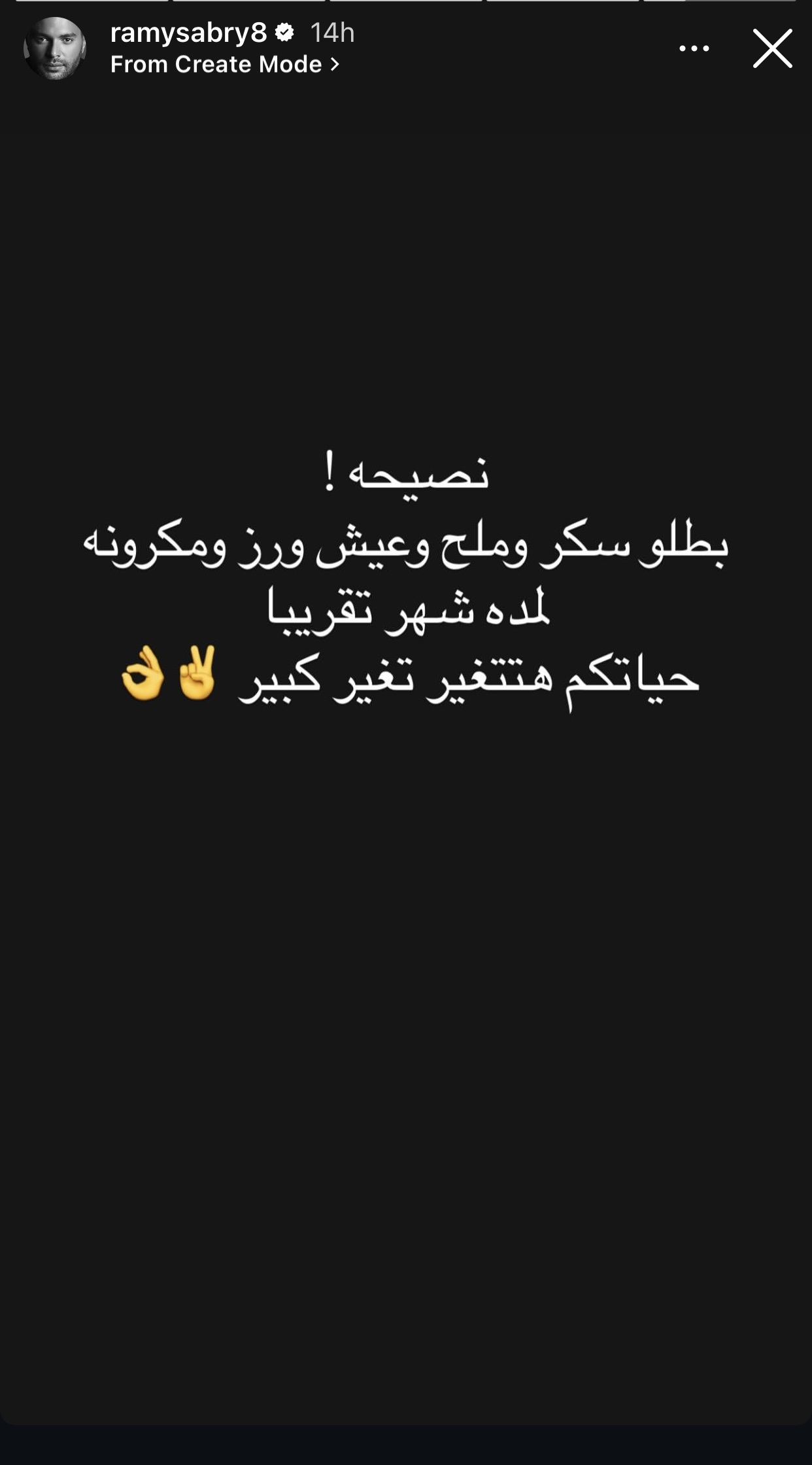 نشر الفنان رامي صبري، عبر خاصية القصص المصوّرة الملحقة بحسابه الخاص في "إنستغرام" رسالة وجّه من خلالها نصيحة الى متابعيه قائلاً: "نصيحة... بطّلوا سكر وملح وعيش ورز ومكرونة لمدة شهر تقريباً.. حياتكم هتتغير تغير كبير".