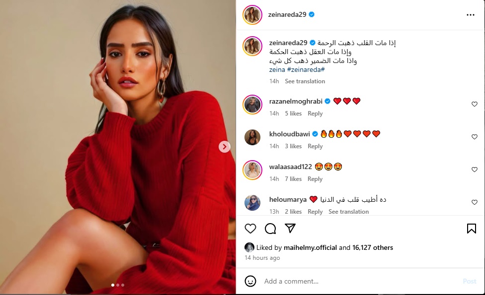 علقت زينة على الصور بقولها: إذا مات القلب ذهبت الرحمة.. وإذا مات العقل ذهبت الحكمة.. وإذا مات الضمير ذهب كل شيء".