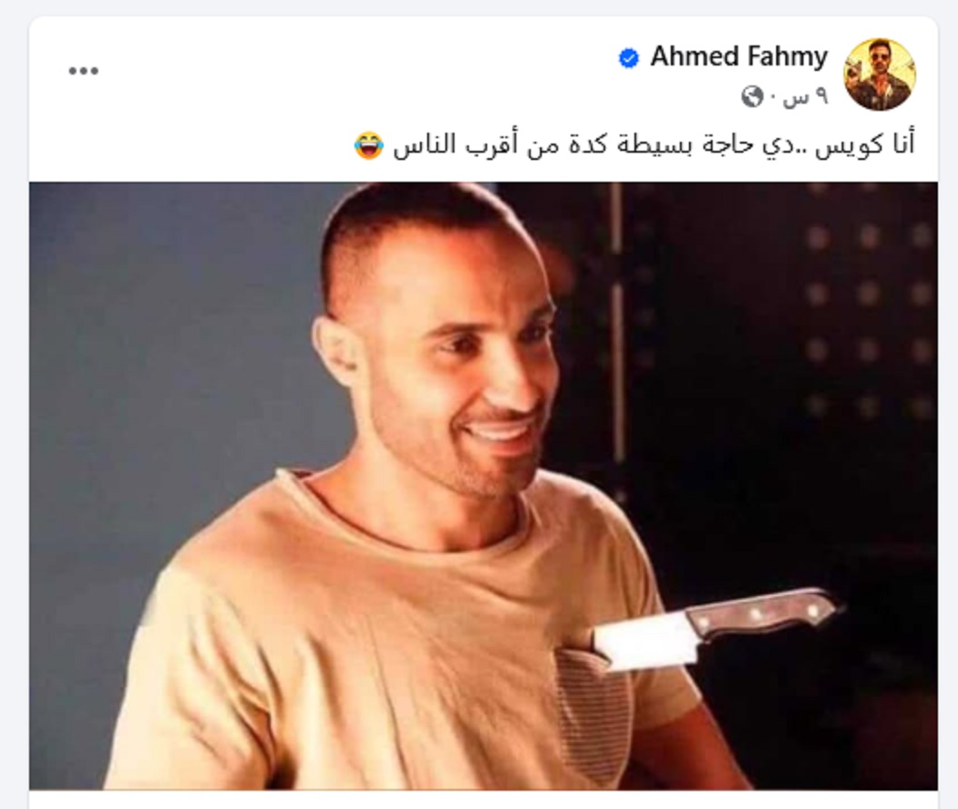 وظهر فهمي في الصورة مبتسماً، بينما غُرست سكين في صدره وتحديداً لجهة القلب، وعلّق عليها قائلاً: "أنا كويس... دي حاجة بسيطة كده من أقرب الناس"، ليفتح التعليق الغامض باب التكهنات حول مغزى الصورة، وهل هي تلميح لتجربة شخصية أم مجرد مشهد تمثيلي!