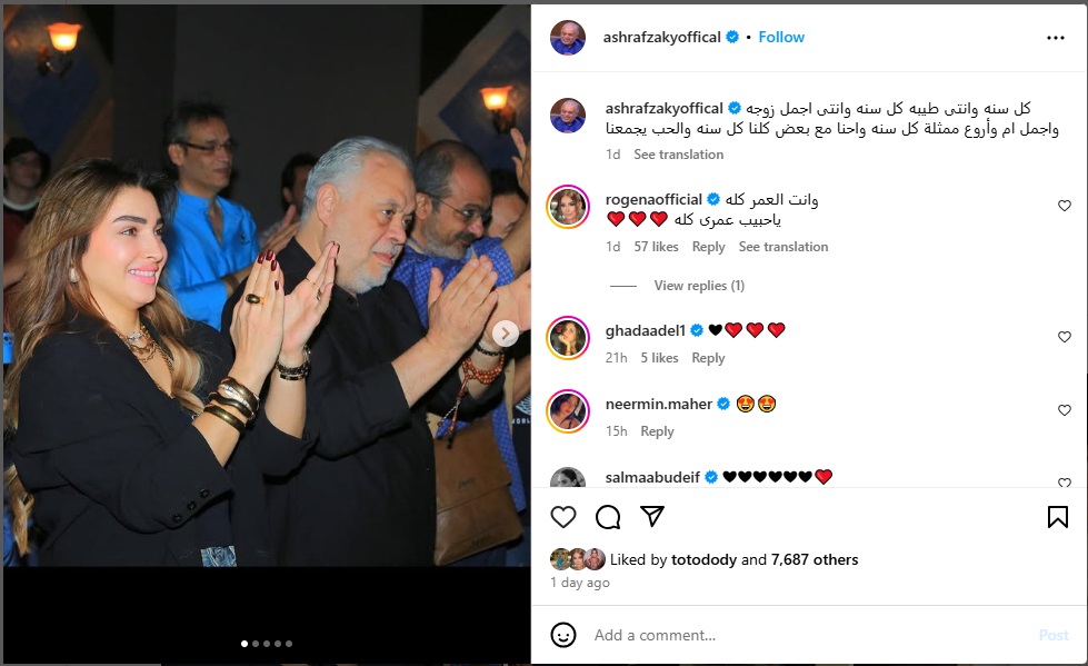 وعلّق أشرف زكي على الصور برسالة مؤثرة قال فيها: "كل سنة وأنتِ طيبة، كل سنة وأنتِ أجمل زوجة وأجمل أم وأروع ممثلة، كل سنة وإحنا مع بعض، كل سنة والحب يجمعنا".