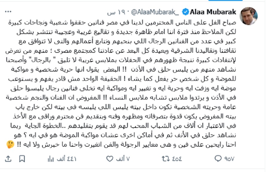 واختتم علاء مبارك رسالته قائلاً: "الخطوة الجاية ربما نشاهد حلق في الأنف، ثم في أماكن أخرى عشان مواكبة الموضة هو في إيه؟ هو إحنا رايحين على فين وهي معايير الرجولة والفن اتغيرت وإحنا ما خبرش ولا ايه!!".