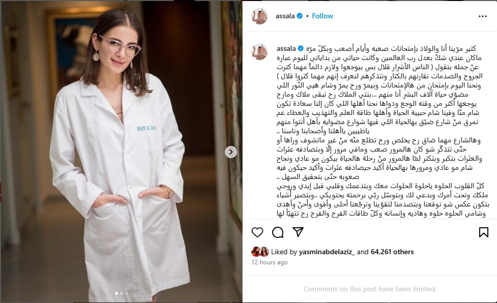 وكتبت أصالة في رسالتها: "كتير مرّينا أنا والولاد بامتحانات صعبة وأيام أصعب وبكلّ مرّة ما كان عندي شكّ بعدل رب العالمين وكانت حياتي من بداياتي لليوم عبارة عن جملة بتقول: (الناس الأشرار قلال بس بيوجعوا ولازم دائماً مهما كترت الجروح والصدمات نقارنهم بالكتار ونتذكرهم لنعرف إنهم مهما كتروا قلال) ونحنا اليوم بامتحان من هالامتحانات وبيمرّ ورح يمرّ".
