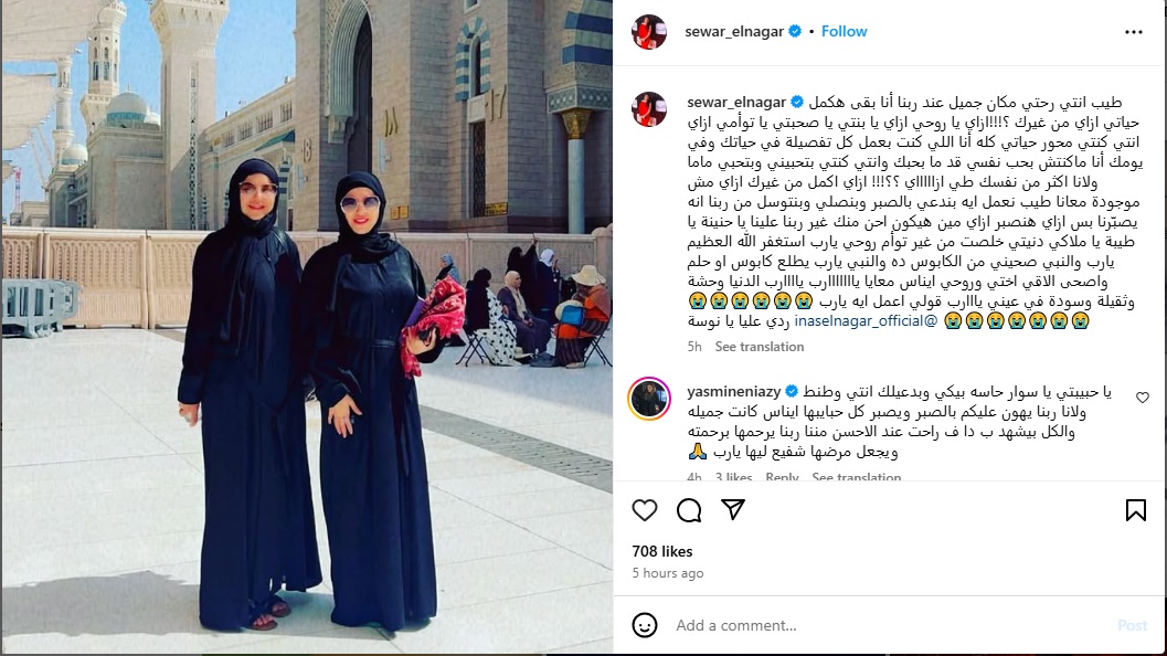 نشرت الفنانة سوار النجار عبر حسابها الخاص على "إنستغرام"، صورة جمعتها بشقيقتها الفنانة الراحلة إيناس النجار، عبرت من خلالها عن حزنها الشديد بعد رحيلها قبل أيام، مؤكدة أنها ما زالت تعيش حالة من الفقد والوجع، ووجهت لها رسالة مؤثرة عبّرت فيها عن ألمها العميق لغيابها، وافتقادها لها في كل لحظة.
