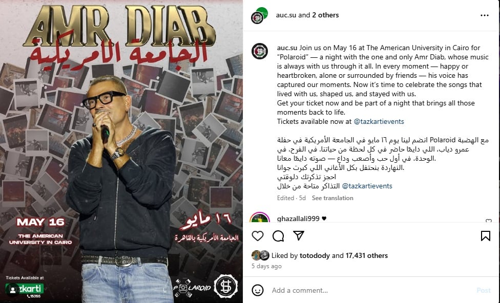 يُحيي النجم عمرو دياب حفلاً كبيراً في الجامعة الأميركية بالقاهرة في 16 أيار (مايو) المقبل، وسط ترقّب جمهوره لحفله الأول في مصر من سلسلة حفلاته لموسم الصيف.