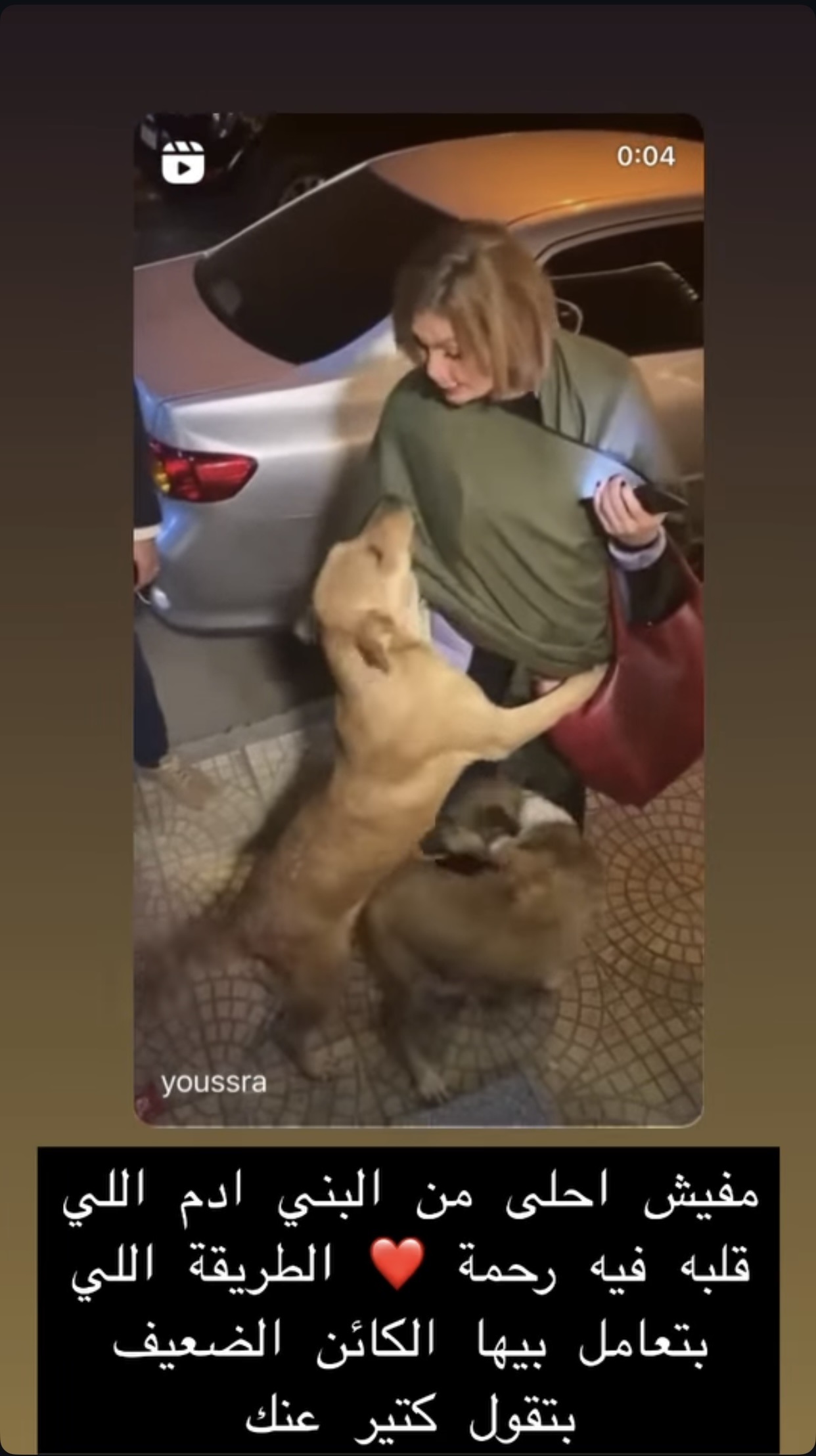 ونشرت يسرا، عبر خاصية القصص المصوّرة الملحقة بحسابها الشخصي في موقع التواصل الاجتماعي "إنستغرام"، فيديو ظهرت فيه وهي تداعب كلاب الشوارع بكل عطف ورحمة، وعلّقت على الفيديو قائلةً: "مفيش أحلى من البني آدم اللي قلبه فيه رحمة، الطريقة اللي بتعامل بيها الكائن الضعيف بتقول كتير عنك".