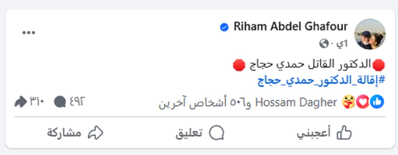 وشاركت ريهام عبد الغفور عبر حسابها الخاص في "فيسبوك"، "هاشتاغ" للمطالبة بإقالة مدير إدارة الطب البيطري في طنطا، بعنوان "إقالة الدكتور حمدي حجاج"، لينضم إليها عدد كبير من الفنانين ومنهم آية سماحة وولاء الشريف.
