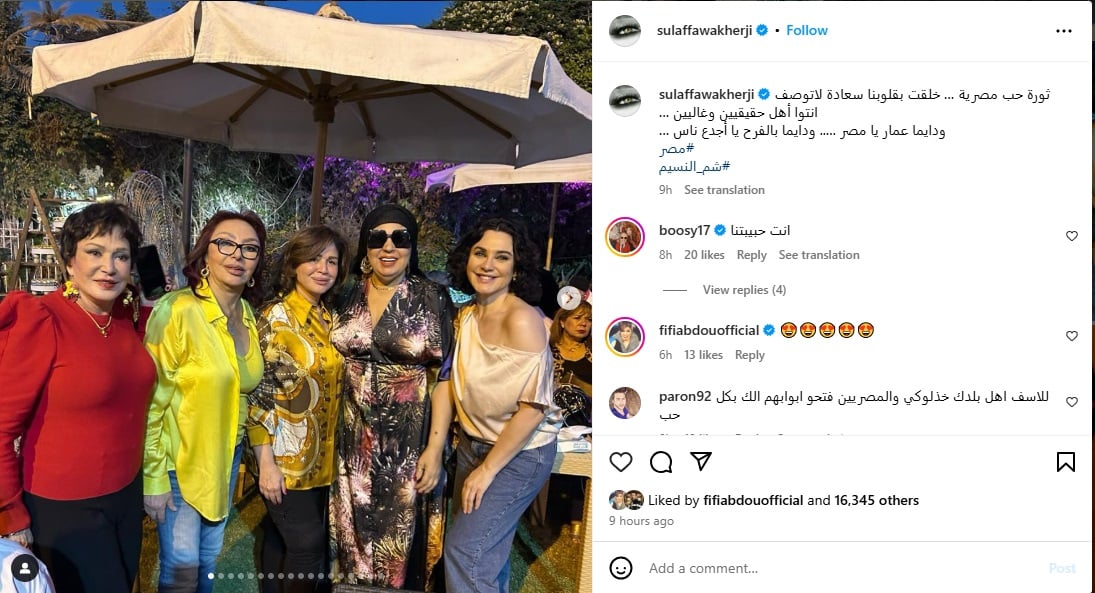 أعادت الفنانة السورية سلاف فواخرجي نشر الصور التي نشرتها الفنانة إلهام شاهين لاحتفالها بأجواء "شمّ النسيم" وأعياد الربيع في مصر رفقة عدد من النجوم.
