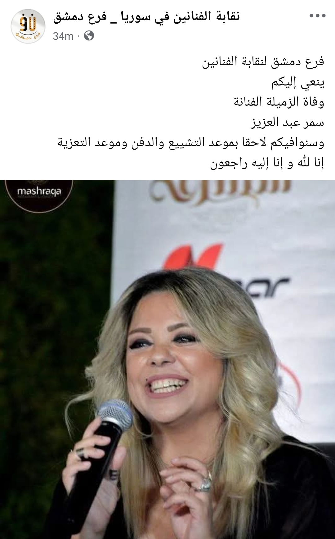 ونشرت صفحة النقابة، فرع دمشق على "الفيسبوك" صورة للراحلة وأرفقتها بتعليق مقتضب أعلنت من خلاله الخبر الحزين، مشيرةً الى أن النقابة ستتابع التفاصيل الأخرى المتعلقة بموعد التشييع والدفن الى أيام التعزية، وستنشرها تباعاً.