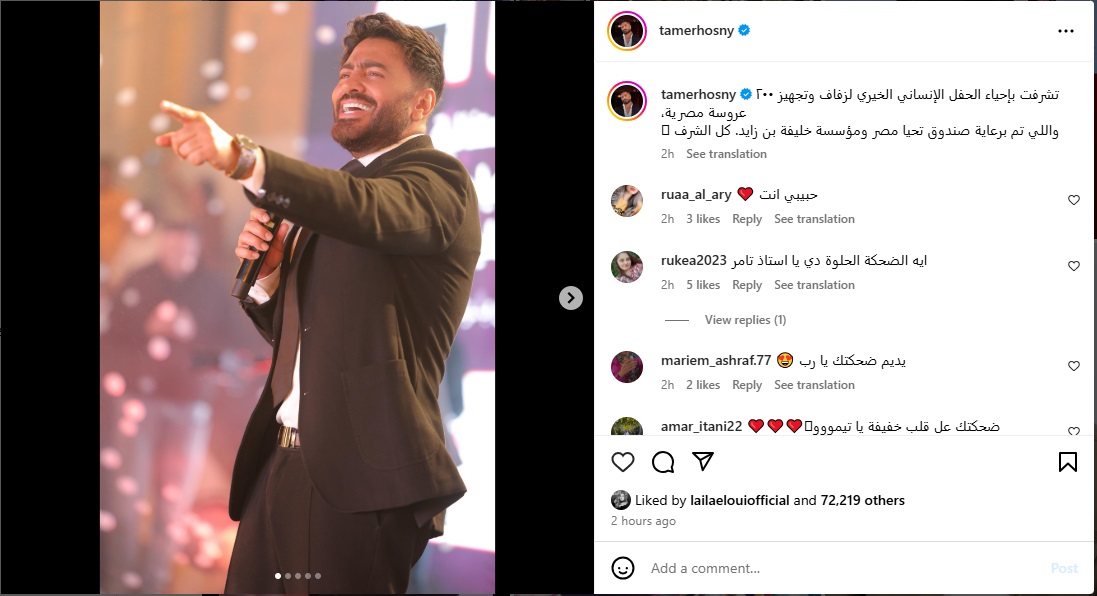 وعلّق تامر على الصور بالقول: "تشرفت بإحياء الحفل الإنساني الخيري لزفاف وتجهيز ٢٠٠ عروسة مصرية، واللي تم برعاية صندوق تحيا مصر ومؤسسة خليفة بن زايد. كل الشرف".