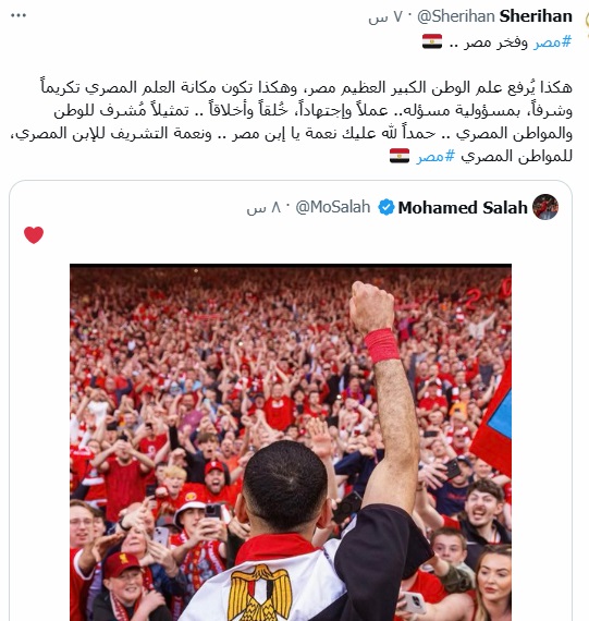 وأشادت شريهان في تعليقها على الصورة بتعامل محمد صلاح مع عَلَم بلاده ووضعه على كتفيه، في إشارة الى أن البعض لا يرفعه بالطريقة المرجوة، وبما يليق بمكانته.