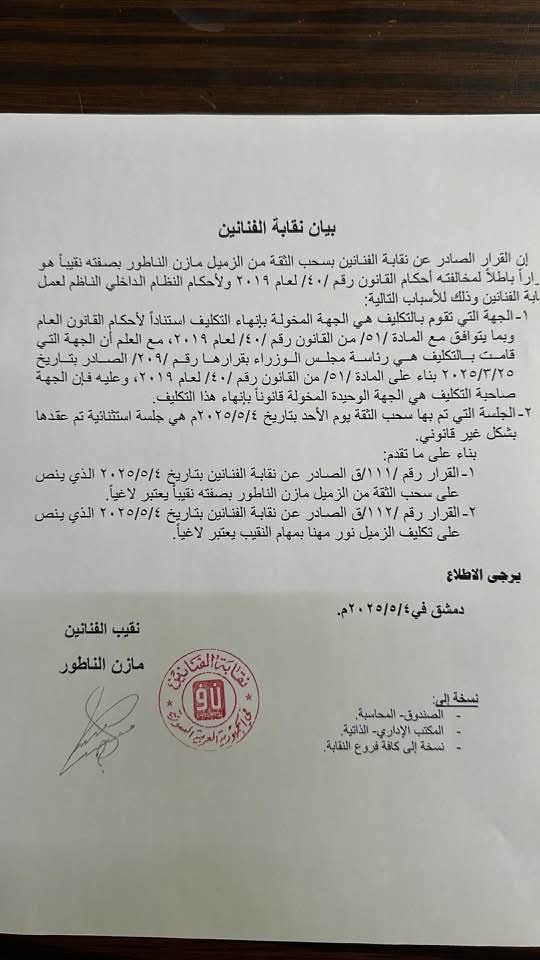 وأشار البيان إلى أن القرار الرقم (171/ن) الصادر في تاريخ 2025/5/4، الذي يتضمن سحب الثقة منه، صدر عن جهة غير مخوّلة قانوناً اتخاذ هذا النوع من القرارات، ولا يُعتدّ به، مشدداً على أن الاجتماع الذي خلاله أُصدر القرار لا يملك أي صفة رسمية أو صلاحية قانونية، حيث خالف أحكام المادة 15 من القانون والنظام المالي للنقابة.