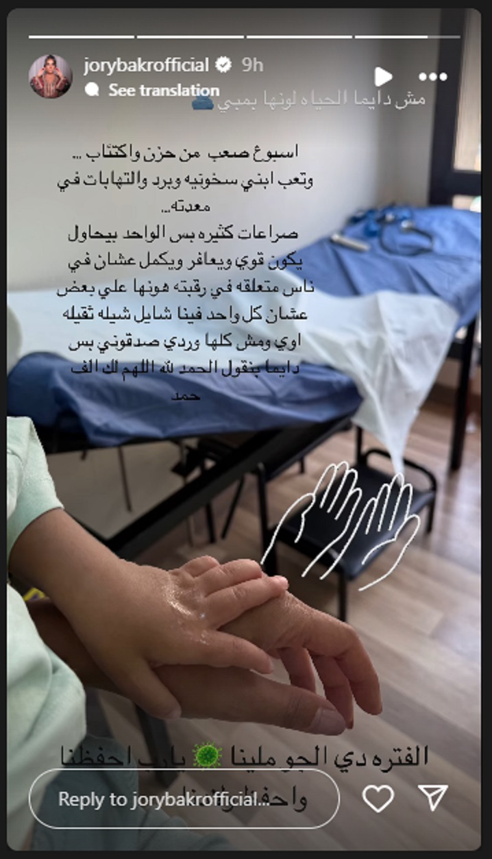 ونشرت جوري من خلال خاصية القصص المصوّرة الملحقة بحسابها الخاص في "إنستغرام"، صورة لغرفة في أحد المستشفيات، وعلّقت عليها بالقول: "مش دايماً الحياة لونها بمبي... أسبوع صعب من حزن واكتئاب وتعب ابني، سخونية وبرد والتهابات في المعدة".