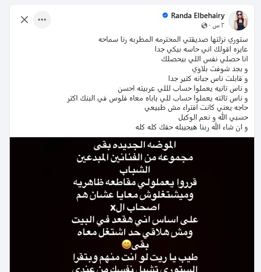 وأعادت الفنانة راندا البحيري نشر منشور صديقتها رنا سماحة عبر صفحتها الخاصة في "فيسبوك"، وعلّقت عليه قائلةً: "ستوري نزلتها صديقتي المحترمة المطربة رنا سماحة... عايزة أقولك إني حاسة بيكي جداً... أنا حصلي نفس اللي بيحصلك وبجد شوفت بلاوي وقابلت ناس جبانة كتير جداً... وناس تانية يعملوا حساب للي عربيته أحسن وناس تالتة يعملوا حساب للي باباه معاه فلوس في البنك أكتر، حاجة يعني كانت افتراء مش طبيعي... حسبي الله ونِعم الوكيل وإن شاء الله ربنا هيجيبلك حقك كله".
