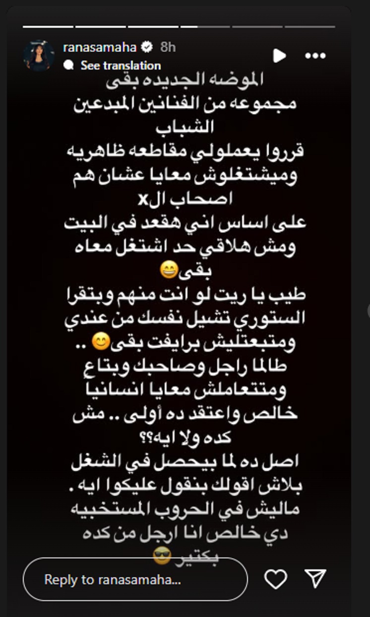 وتابعت: "طيب ياريت لو أنت منهم وبتقرا الستوري تشيل نفسك من عندي ومتبعتليش برايفت بقى... طالما راجل وصاحبك وبتاع ومتتعاملش معايا إنسانياً خالص وأعتقد ده أولى... مش كده ولا إيه؟؟... أصل ده لما بيحصل في الشغل بلاش أقولك بنقول عليكوا إيه... ماليش في الحروب المستخبّية دي خالص أنا أرجل من كده بكتير".