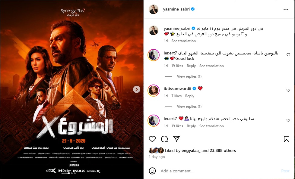 وأرفقت ياسمين البوسترين بتعليق كتبت فيه: "المشروع X في دور العرض في مصر يوم 21 مايو و5 يونيو في جميع دور العرض في الخليج".