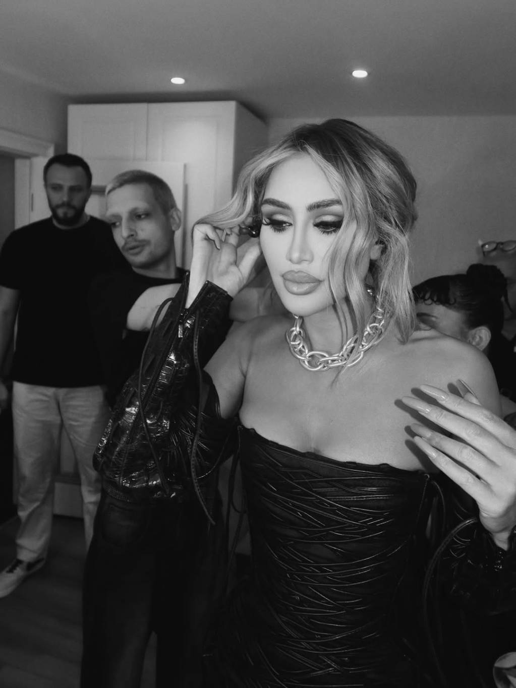 ما جعل هذه الإطلالة أكثر تميزاً وجرأة هو التفاصيل الإضافية التي اختارتها مايا بعناية. فقد نسّقت الفستان مع حذاء بشرائط عالية جداً تمتد على طول الساق، ما منح الإطلالة طابعاً مسرحياً لافتاً. كما أضافت عقداً من السلاسل، عكس أسلوب الـ Grunge الجريء الذي سيطر على اللوك بالكامل.