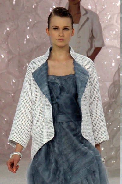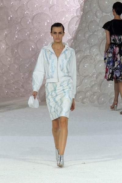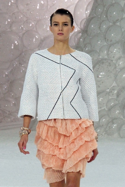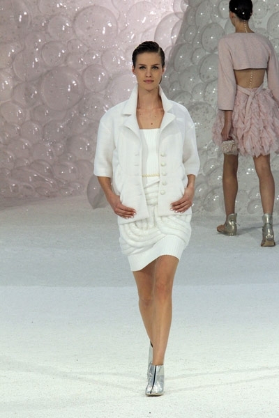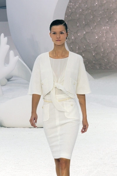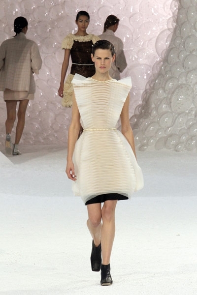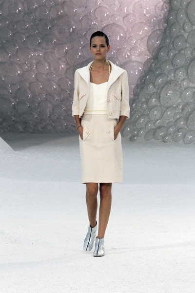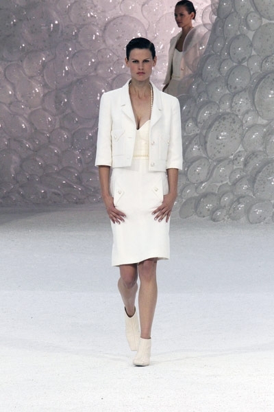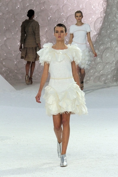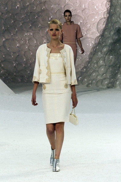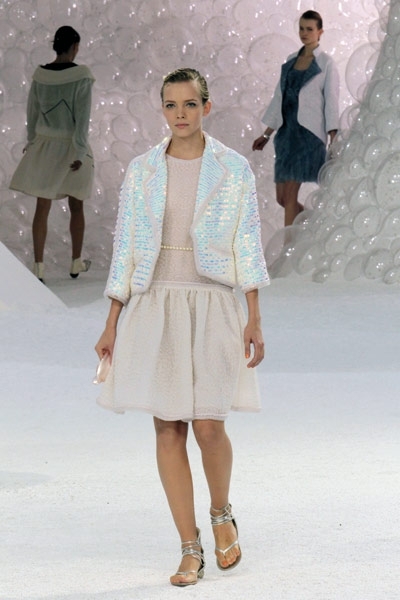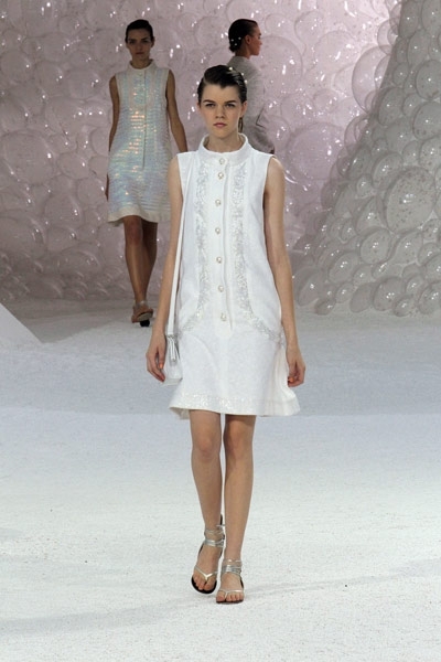 وكأن عرض كارل لاغرفيلد لدار شانيل هذا الموسم ثمرة المحار. هذا ما اكتمل مع تصميم منصة العرض على هيئة فقاعات شفافة تحاكي أعماق البحار. لا يمكن تحديد سمة واحدة للفستان الأبيض الصغير الذي أطلقت شانيل العنان لنقائه هذا الموسم. فقد جاءت تصاميمه قطنية وهندسية ومكسوة بالريش كذلك حملت بريق اللؤلؤ، ترصيعاً وزخرفة وحياكة. وقد انصهرت بشرة اللؤلؤ بأقمشة التويد والترتر، فيما تدفقت على بعض التصاميم حبات مشبوكة ومتلاونة... العلامة الأعرق لدى دار شانيل التي أحاطت بالخصور بيضاء. وبعكس خطوط الفساتين الشانيلية المنفرجة، استقامت تنورة التايور الكلاسيكي المطرّز بالجيوب.