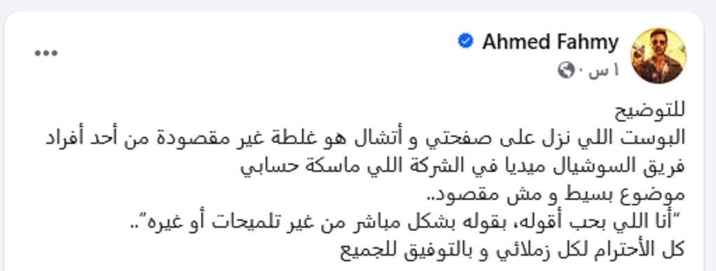 قال فهمي في توضيحه: "للتوضيح.. البوست اللي نزل على صفحتي واتشال هو غلطة غير مقصودة من أحد أفراد فريق السوشيال ميديا في الشركة اللي ماسكة حسابي.. موضوع بسيط ومش مقصود.. أنا اللي بحب أقوله، بقوله بشكل مباشر من غير تلميحات أو غيره.. كل الاحترام لكل زملائي وبالتوفيق للجميع".