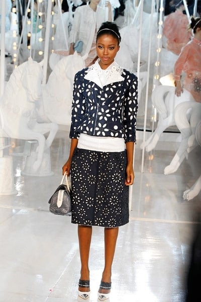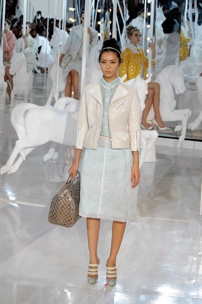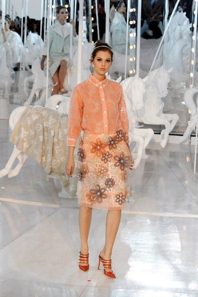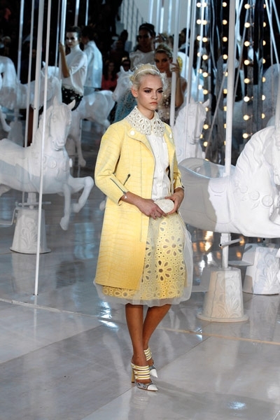 يصيبك عرض المصمّم مارك جايكوبس بالدوار، وليس السبب الكاروسيل التي تموضعت على منصة العرض بل تلك الألوان الرقيقة التي استوحاها من لعبة الطفولة والرومانسية البسيطة. تلك التي ركبتها العارضات وطافت حولها. فيما تفتح الربيع بألوان قوية وخجولة على شكل زهرات المرغريتا وبتلاتها (تخريم وتطريز) على أزياء دار لوي فويتون هذا الموسم مستغنياً عن نقشها أو طباعتها. عبر هذا الاتجاه، عاد مارك جايكوبس إلى الطفولة الرومانسية التي تقطف البتلات وتحصيها. أما القصات التي اعتمدها المصمّم، فهي جامدة غير متآخية مع جسم المرأة، والمنفرجة خصوصاً معاطف الربيع الصغيرة (المريّشة والمصنوعة من جلد التمساح) والتنانير المغلّفة بالأورغنزا. اما سمة الأكسسوار الذي طبع هذه المجموعة، فهي الحذاء ذو المقدمة الحادة.