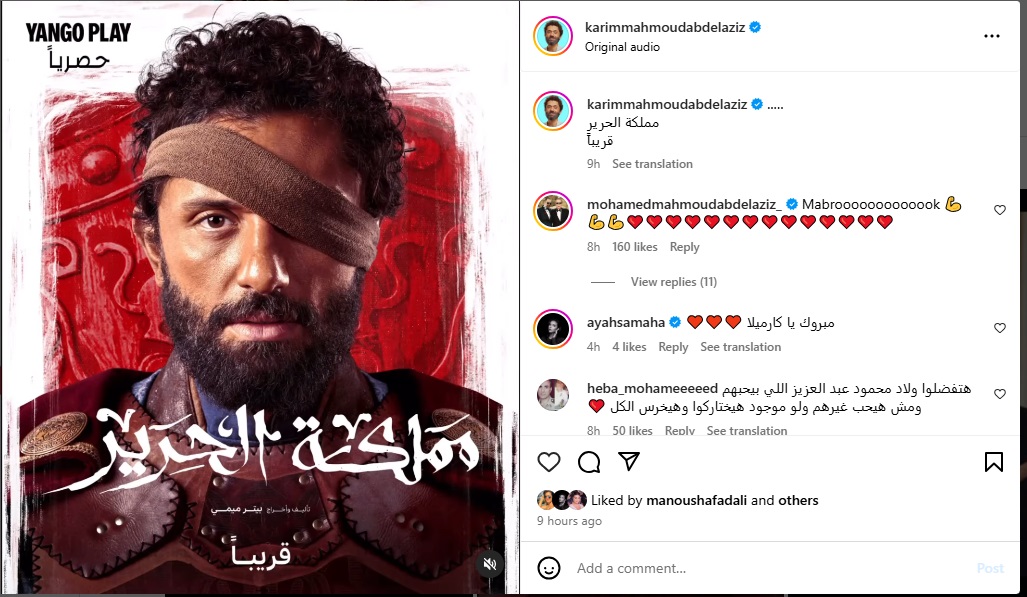 ونشر كريم عبر حسابه الخاص في "إنستغرام" البوستر الرسمي للمسلسل، وعلّق عليه قائلاً: "مملكة الحرير... قريباً"، ولاقى المنشور تفاعلًا من الفنانين والجمهور.