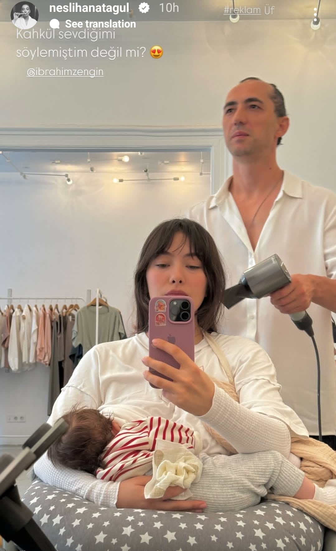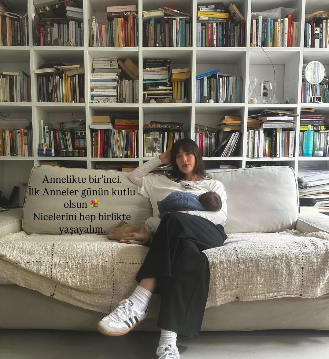 وتحرص النجمة التركية على مشاركة متابعيها بصورها وهي تحمل طفلها وتهتم به في كل الأماكن والأوقات، ولكنها تخفي ملامحه عن وسائل الإعلام لحمايته من بعض التعليقات المتنمّرة.