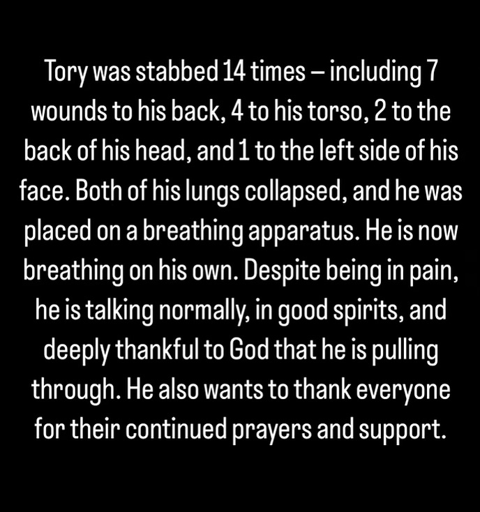 وأعلنت الصفحة الرسمية للمغنّي الشاب الخبر في منشور كتبت فيه: "طُعن توري لينز 14 مرة، بما في ذلك 7 جروح في ظهره، و4 في جذعه، و2 في مؤخرة رأسه، وطعنة واحدة في الجانب الأيسر من وجهه. انهارت رئتاه، ووُضع على جهاز التنفس. وهو الآن يتنفس من تلقاء نفسه".