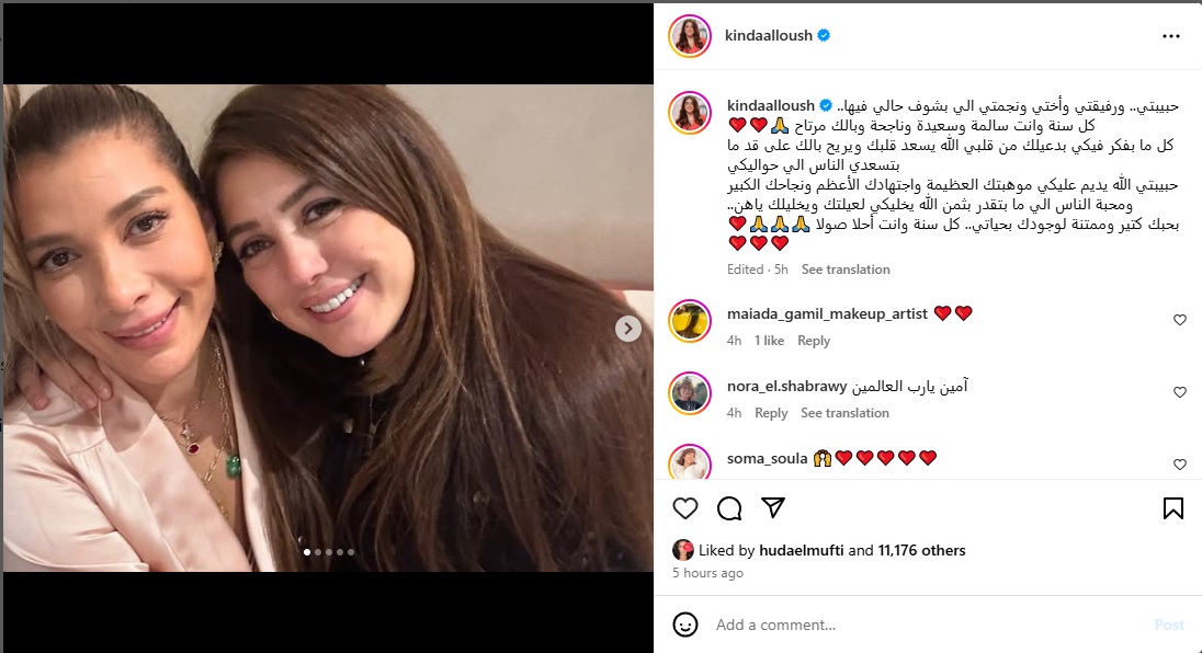 وقالت كندة في رسالتها لأصالة: "حبيبتي... ورفيقتي وأختي ونجمتي اللي بشوف حالي فيها... كل سنة وأنت سالمة وسعيدة وناجحة وبالك مرتاح".