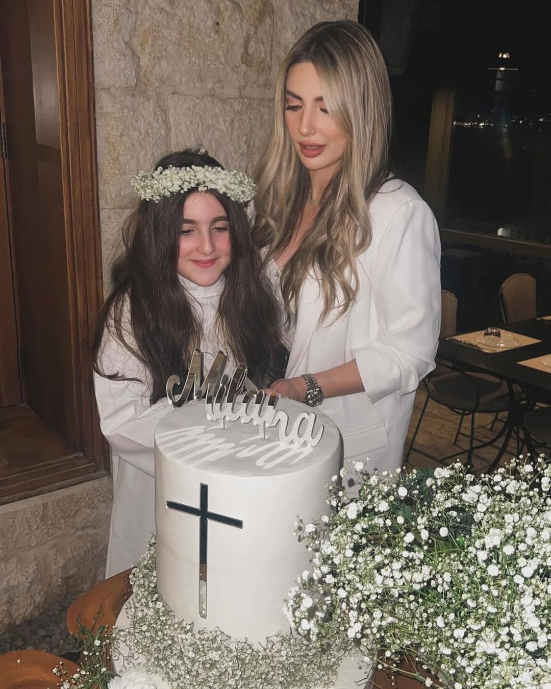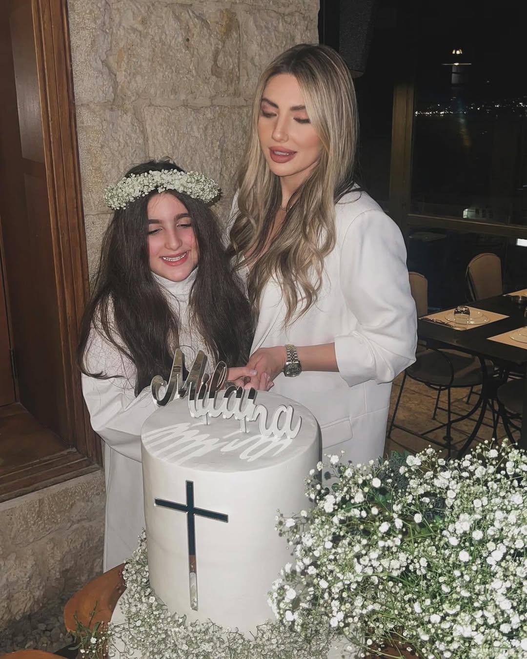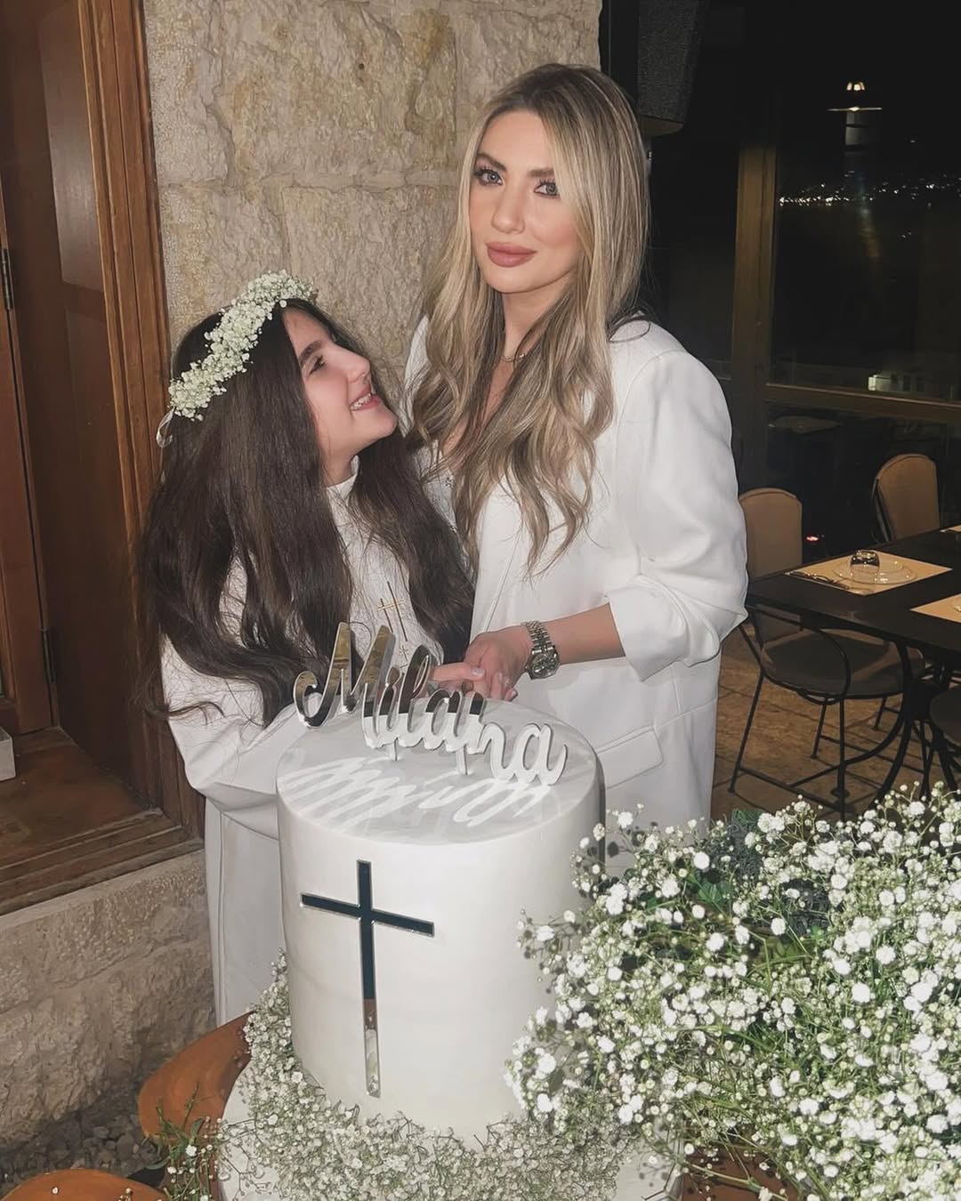 وحرصت السيدة اللبنانية على تجهيز الحلويات والمكان بما يتناسب مع المناسبة الدينية، واختارت الورود البيضاء الصغيرة لتزيين المكان، ولفتت الطفلة الأنظار في أول ظهور لها بسبب الشبه الكبير بينها وبين والدها الذي يبدو أنه لم يتواجد في الحفل الذي تلى المناسبة الدينية.