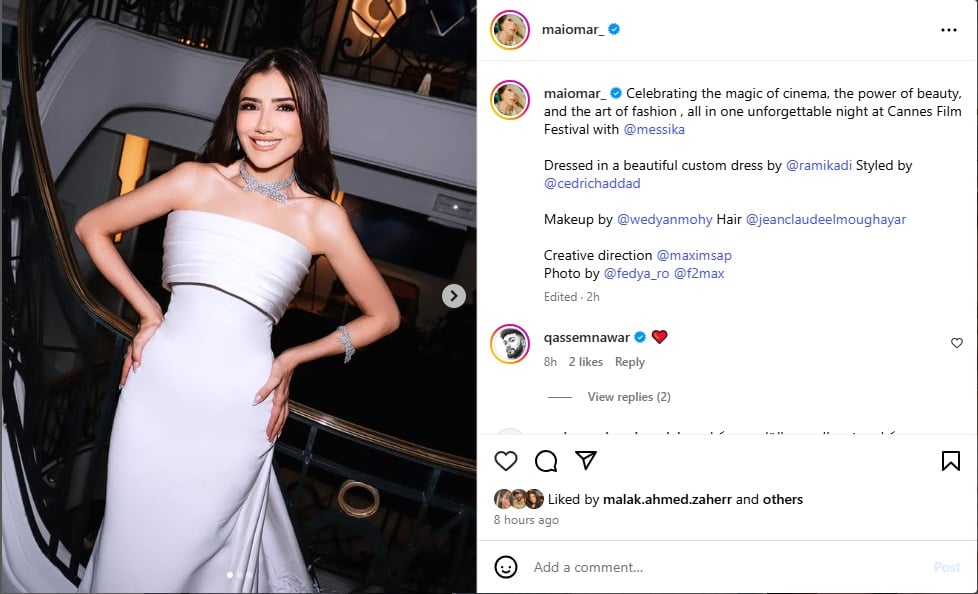 وعلّقت مي على الصور قائلةً: "لحظات ذهبية على الريفييرا الفرنسية... تشرّفت بالتألق على السجادة الحمراء اليوم في "مهرجان كان السينمائي"، مزيّنة بملابس خلاّبة... ليلة لا تُنسى".
