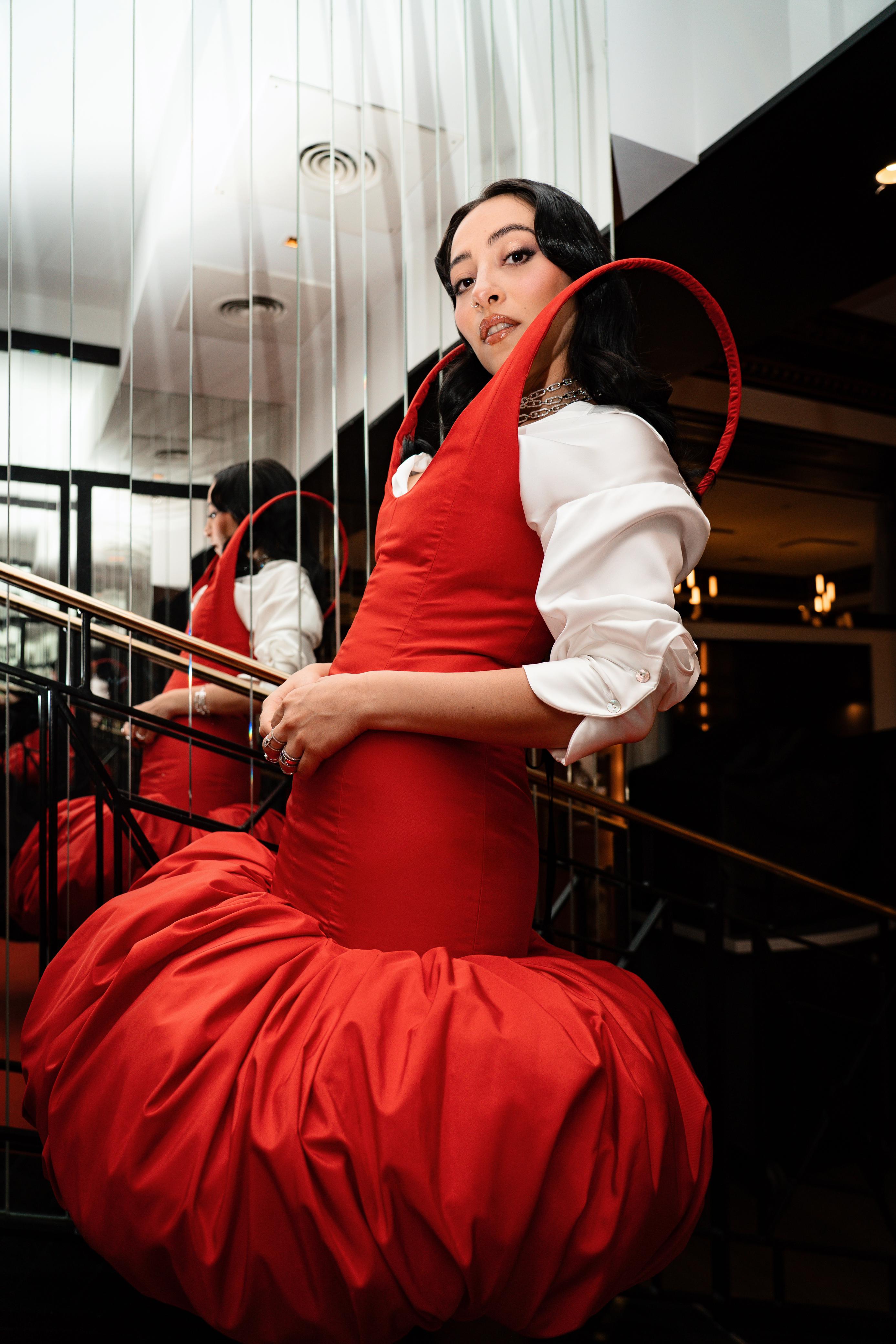 واختارت سارة للحفل فستاناً مختلفاً باللون الأحمر، بتصميم خارج عن المألوف، من توقيع المصمّم السوري مثنى الحاج علي المقيم في فرنسا، وهي أول مجموعة له، وجاء الفستان مجسّماً مع حمّالات دائرية عالية بشكل هندسي، ومن الأسفل بتنورة منفوشة بكشكش مع تكسيرات ناعمة، وأكملت سارة إطلالتها بقميص أبيض كلاسيكي.