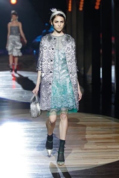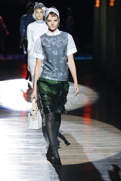 ارتفع الستار لنرى جميع العارضات على كراس مثل المسرح الفرنسيّ الراقص. كلّ عارضة قامت عن الكرسيّ ومشت بدورها بتنانير من الجلد، بعضها ملفوفة بالبلاستيك الشفّاف، طويلة تصل الى ما تحت الركبة، معها سترات قصيرة فضيّة اللون. الأزياء كانت لمّاعة فيها الكثير من الضوء، أحياناً بدرجات مختلفة من اللون نفسه.