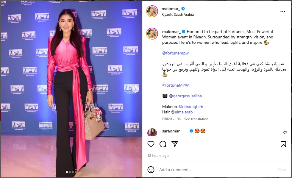 نشرت الفنانة مي عمر عبر حسابها الخاص في "إنستغرام" صورة لها وثّقت من خلالها مشاركتها ضمن فعالية "أقوى نساء" التي أُقيمت في مدينة الرياض بالمملكة العربية السعودية.