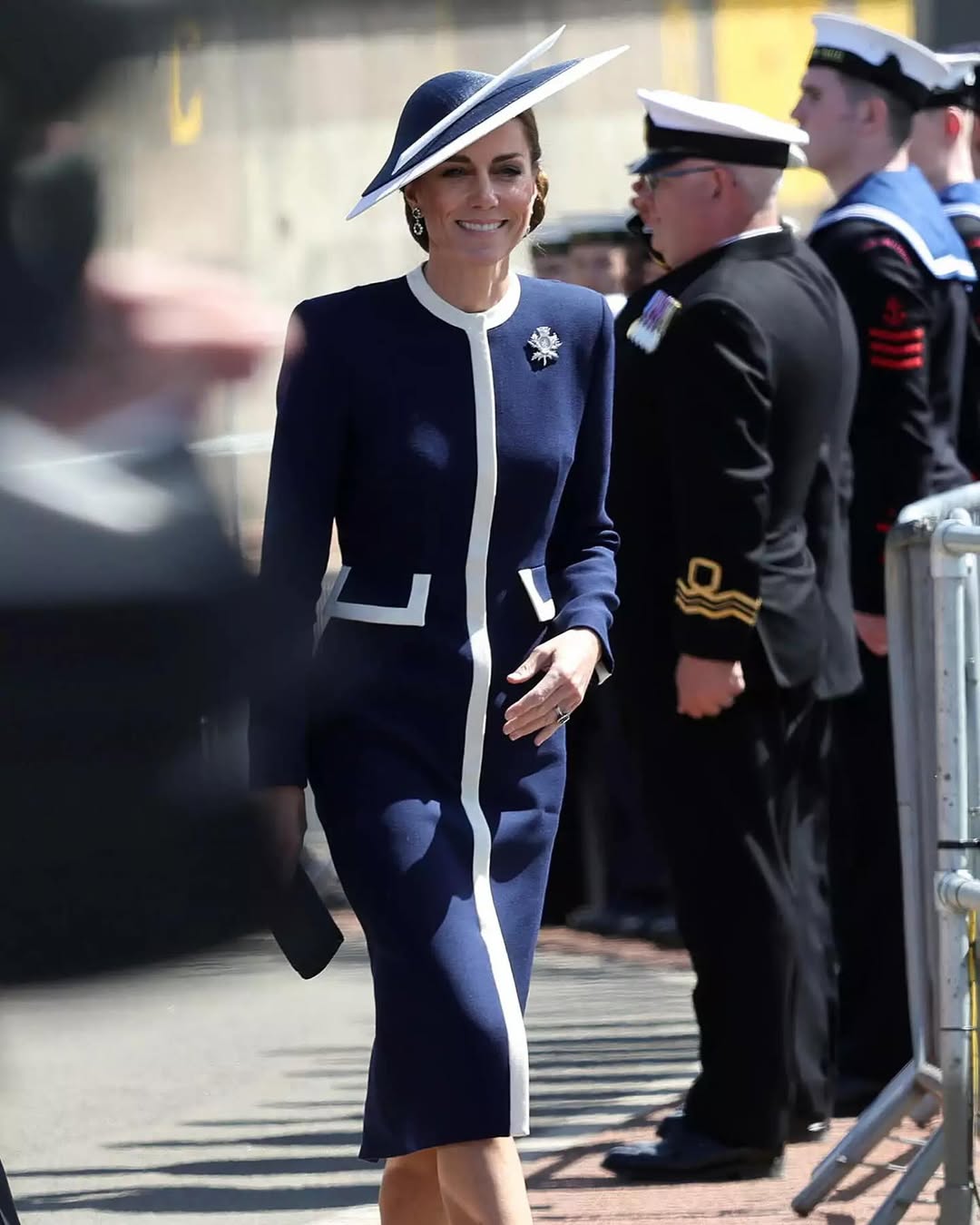 اختارت أميرة ويلز فستان معطف كلاسيكي بلون أزرق داكن، زُيّن بخطوط بيضاء رفيعة تعكس جوهر الأزياء البحرية التقليدية، بتوقيع علامة الأزياء البريطانية "سوزانا لندن"، المعروفة بتصاميمها التي تزاوج بين الرصانة والأنوثة. القَصّة جاءت منسجمة تمامًا مع طبيعة المناسبة، مضفية على الإطلالة طابعاً رسمياً هادئاً لكنه مليء بالدلالات.
