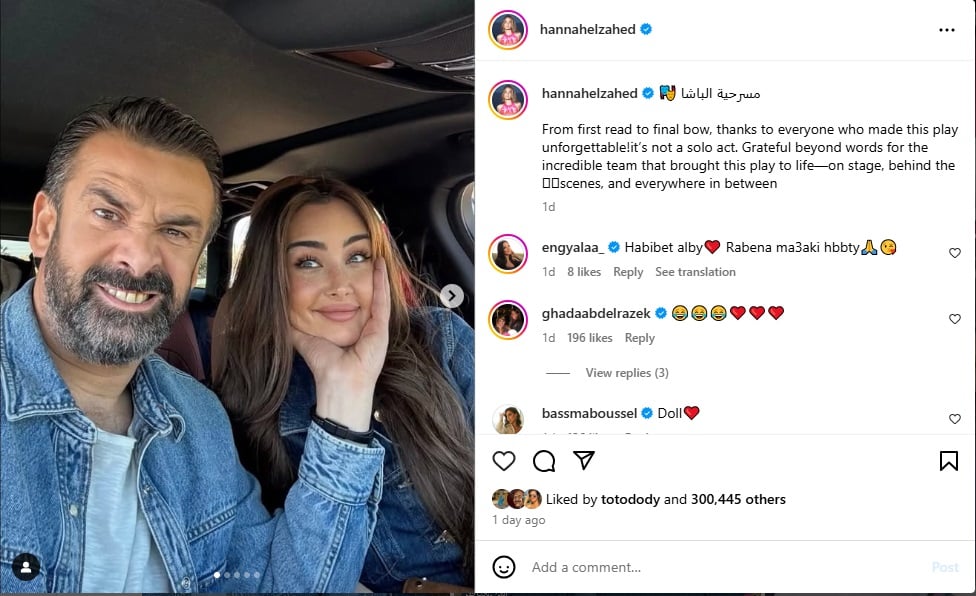 وعلّقت هنا على الصور برسالة وجّهت خلالها الشكر الى كل مَن ساهم في نجاح هذا العمل، قالت فيها: "مسرحية "الباشا" من القراءة الأولى وحتى النهاية، شكراً لكل مَن ساهم في جعل هذه المسرحية لا تُنسى. هي ليست عملاً منفرداً، وأنا ممتنة للغاية للفريق الرائع الذي جلب هذه المسرحية الى الحياة، على المسرح، وخلف الكواليس، وفي كل مكان بينهما".