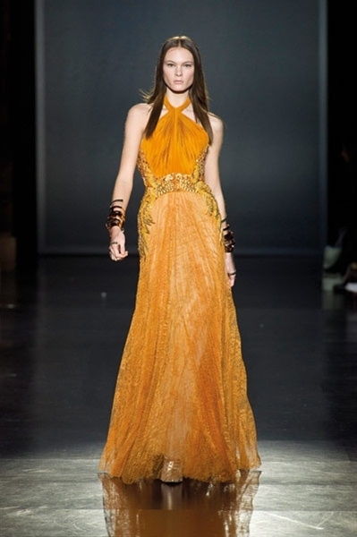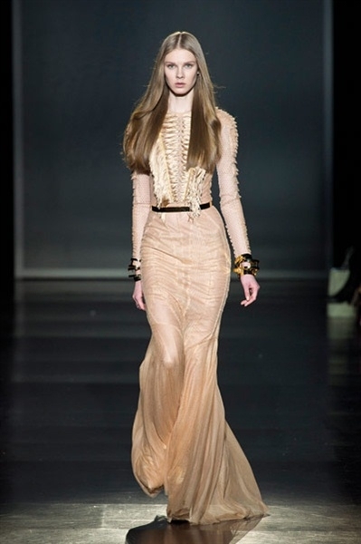 لعب الأكسسوار هنا دوراً مهما. اكتملت الطلّة الراقية بين الأقمشة الشفافة بألوانها الترابية والأكسسوارات التي التقطت الخصور مع القصّات الضيقة.