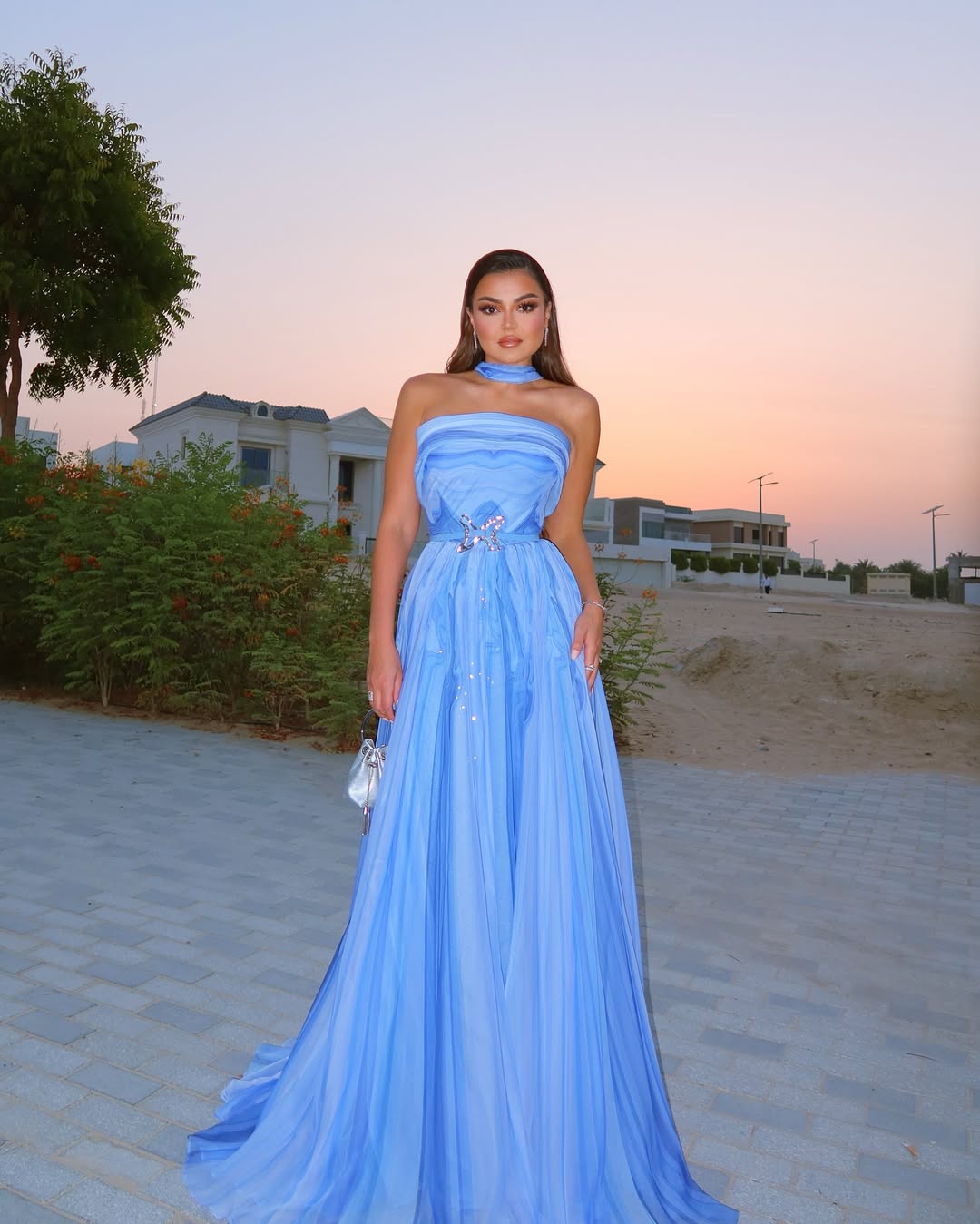 تألقت لين أبو شعر بفستان أزرق فاخر من علامة Eli The Label، بدون أكمام، بتصميم انسيابي مع تنورة واسعة قليلاً بطيات أنيقة. أبرزت جمال وجهها بمكياج برونزي قوي وتسريحة جانبية أنيقة.