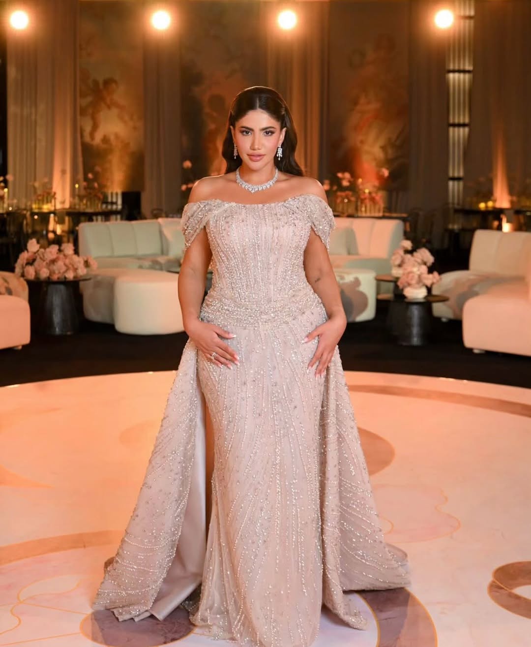 في هذه الأمسية المضيئة، خطفت نور الأنظار بفستان خطوبة ملوكي من توقيع دوبا علاء، جاء بلون لؤلؤي هادئ، مكشوف الأكتاف بقصة منسدلة تنساب على الجسم بانسيابية أنثوية. أضفى الذيل الطويل رونقاً خاصاً على إطلالتها، بينما زيّن مكياج النيود وتسريحة الشعر المشدودة إلى الخلف بأسلوب كلاسيكي مظهرها بمزيد من التوهّج. وأكملت الفخامة بمجوهرات ماسية آسرة.