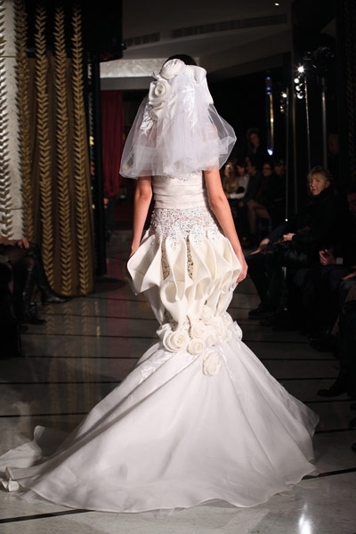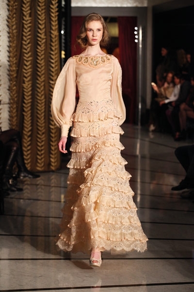 الأقمشة منسدلة غير منتفخة، مخرّمة مكشكشة مكسوة بالدانتيل، كما علّقت على بعضها ورود ساتينية.