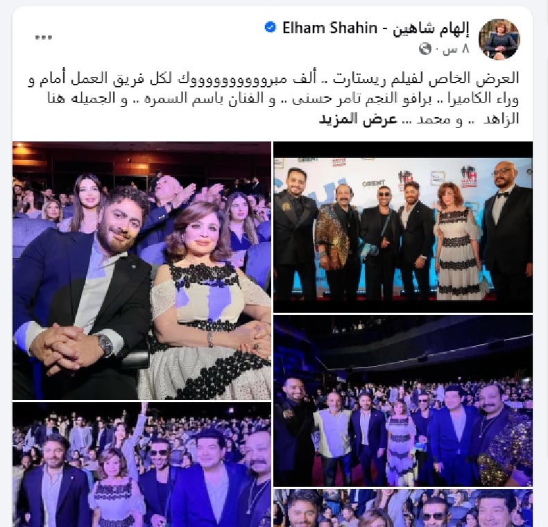 نشرت الفنانة إلهام شاهين على حسابها الخاص بـ"فيسبوك" مجموعة من الصور من العرض الخاص لفيلم "ريستارت" وجَّهت من خلالها رسالة للفنان تامر حسني وصنّاع الفيلم.