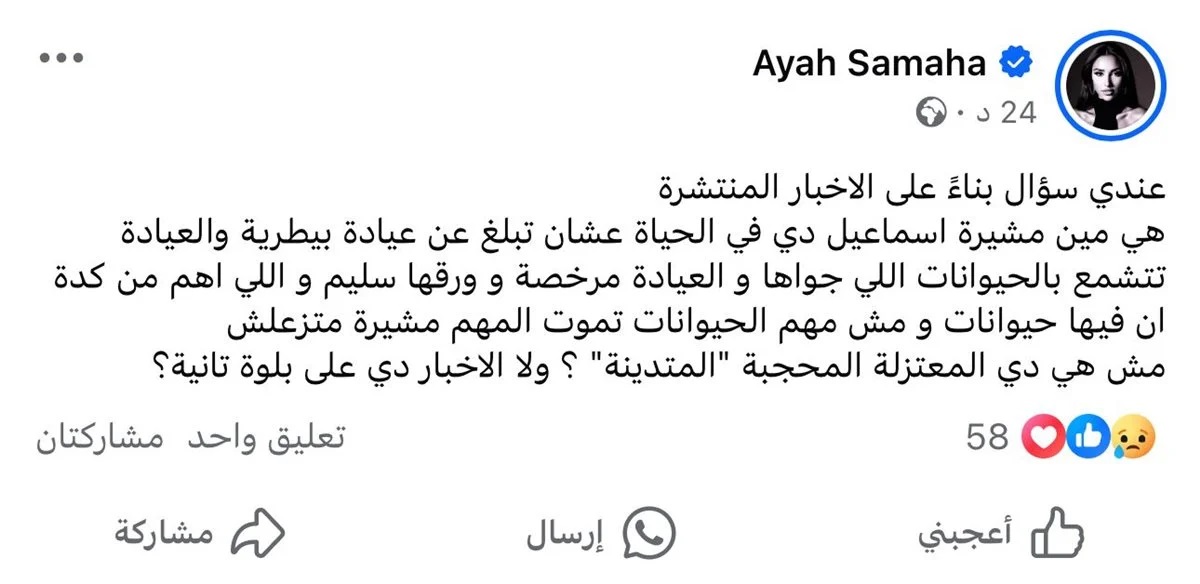 كتبت آية منشورًا عبر حسابها الرسمي على "فيسبوك"، تساءلت فيه عن هوية مشيرة إسماعيل وتأثيرها، قائلة: "عندي سؤال بناءً على الأخبار المنتشرة، هي مين مشيرة إسماعيل دي في الحياة؟ عشان تبلغ عن عيادة بيطرية والعيادة تتشمع بالحيوانات اللي جواها؟ العيادة مرخصة وورقها سليم، والمهم مش الحيوانات تموت.. المهم مشيرة متزعلش؟ مش هي دي المعتزلة المحجبة المتدينة؟ ولا الأخبار دي على واحدة تانية؟".