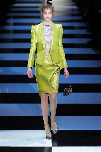 الأخضر في أرماني هو لون الموسم بامتياز. القصّات جالسة حادّة، تمتزج كلاسيكيتها بأنوثة راقية. الأقمشة لمّاعة او موشّاة بأشكال خلايا أو نقاط تنسجم انسجاماً تاماً مع نوع القماش والصورة التي يعكسها.