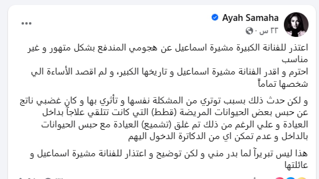 واختتمت آية سماحة اعتذارها بالقول: "هذا ليس تبريراً لما بدر مني، ولكنه توضيح واعتذار للفنانة مشيرة إسماعيل وعائلتها".
